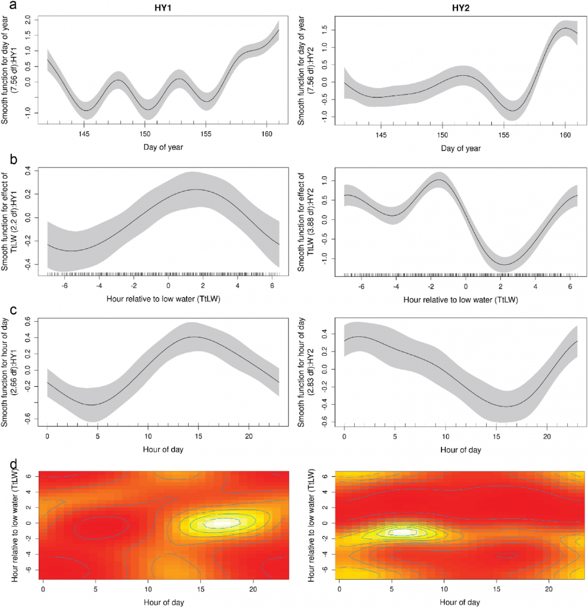 图2 两个固定式被动声学监测站点每小时海豚蜂鸣声的广义加性模型。图(b)显示了海豚觅食活动的潮汐模式。