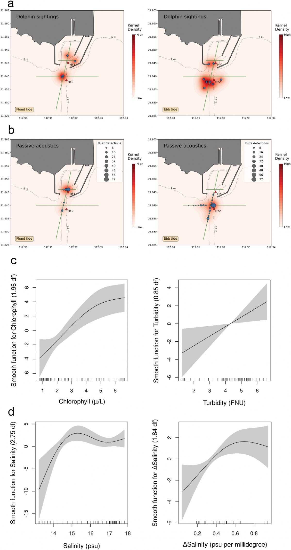 图3 海豚的空间分布及其与环境变量的相关性。图(a)和图(b)显示了海豚觅食活动在涨落潮期间聚集性分布的变化;图(c)和图(d)揭示了海豚蜂鸣声与叶绿素、浊度、盐度和盐度梯度的相关性。