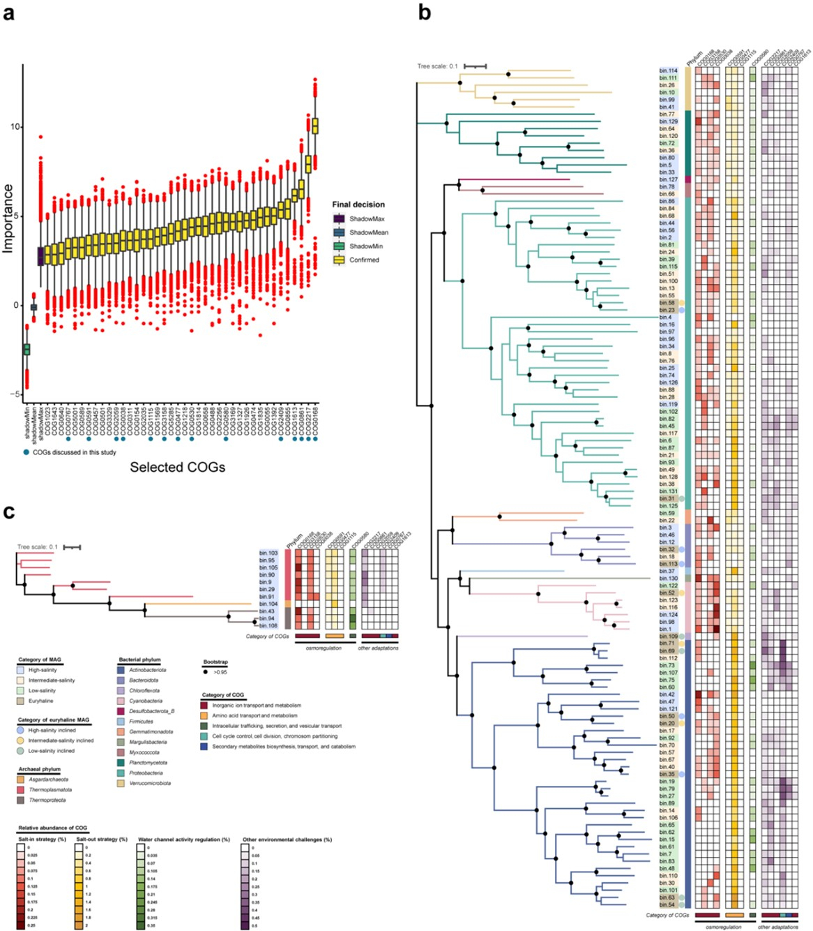 本研究团队进一步针对127个微生物基因组的12162功能基因,开展了基于机器学习的特征选择分析,筛选出的40个特征基因中,有四个为“salt-in”盐度适应性相关的功能基因(图2),且钾离子转运系统(Trk型)被识别为最重要的特征功能基因,其在群落整体、微生物基因组以及主导类群Proteobacteria(变形菌门)和Actinobacteriota(放线菌门)中都表现出随着盐度条件的升高而相对丰度显著增加的趋势,表明“salt-in”策略在河口微生物群落的盐度适应性演化过程中,发挥着重要作用。