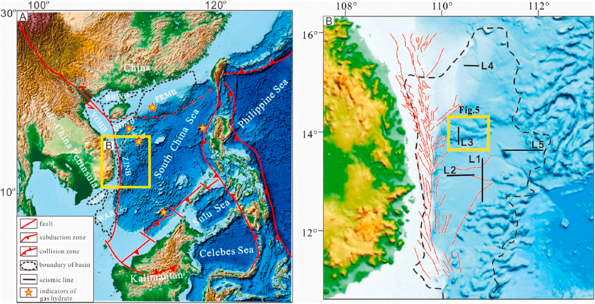 图1 南海区域构造及中建南盆地大地构造位置(图A中的星号为南海已发现天然气水合物标识的位置)