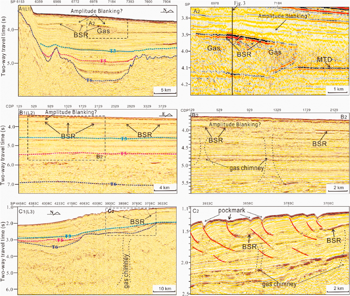 图2 中建南盆地中部天然气水合物在地震剖面上的标识,具有明显的BSR特征,BSR之上存在空白反射层,BSR之下有气体向上运移的通道(气烟囱)。