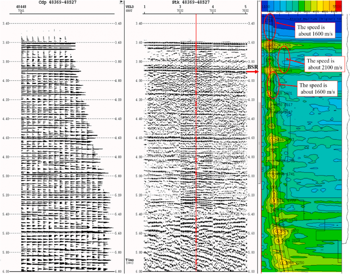 图3 与地震剖面相对应的速度图谱显示天然水合物层具有明显的速度反转特征,在3.6-3.9s之间(BSR之上),P波的速度为2100m/s,明显大于上层和下层的速度,代表稳定天然气水合物层,而BSR及以下层速度仅为1600m/s。图谱上的速度反转特征与图2A地震反射剖面上解译的天然气水合物标识相一致。