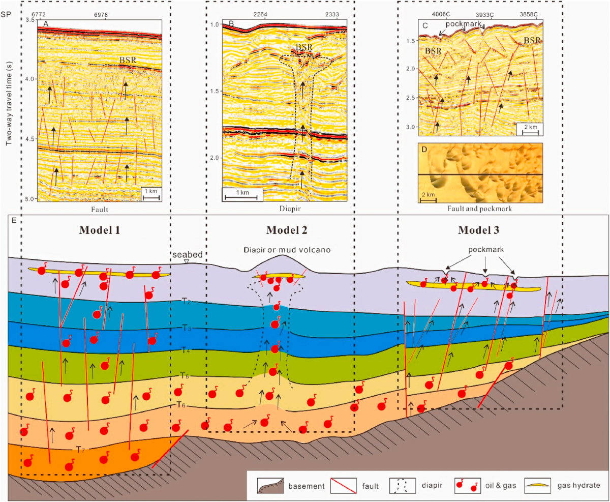 图4 中建南盆地中部的三种天然气水合物成藏模式:第一种是气体沿着断裂带向上运移,在浅层形成天然气水合物层;第二种是气体沿着泥火山或泥底辟向上运移,在泥火山或泥底辟顶部形成天然气水合物层;第三种是气体沿断裂带向上运移,在浅部形成天然气水合物层,与第一种模式不同的是,在海底处发育有麻坑,可能会在一定程度上造成天然气水合物的散失。