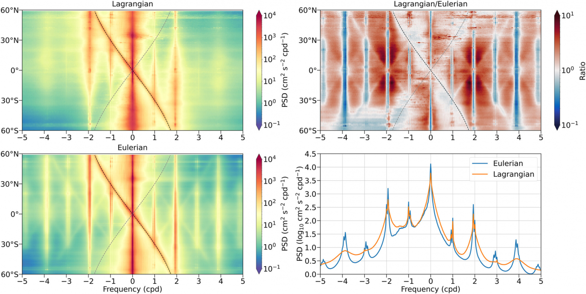海洋表层流场在全球气候变化和海洋生态系统的演变中起着至关重要的作用。目前我们对大尺度低频流场的空间分布已有较好的了解,但全球海洋高频中小尺度过程(比如内潮和近惯性波)的空间分布仍不清晰。对此,我院海洋环流与物质输运团队及合作者基于高分辨率海洋模型(LLC4320)开展全球海洋拉格朗日粒子数值实验,对比了欧拉和拉格朗日框架下海洋流速频率谱和各频段的动能空间分布。
