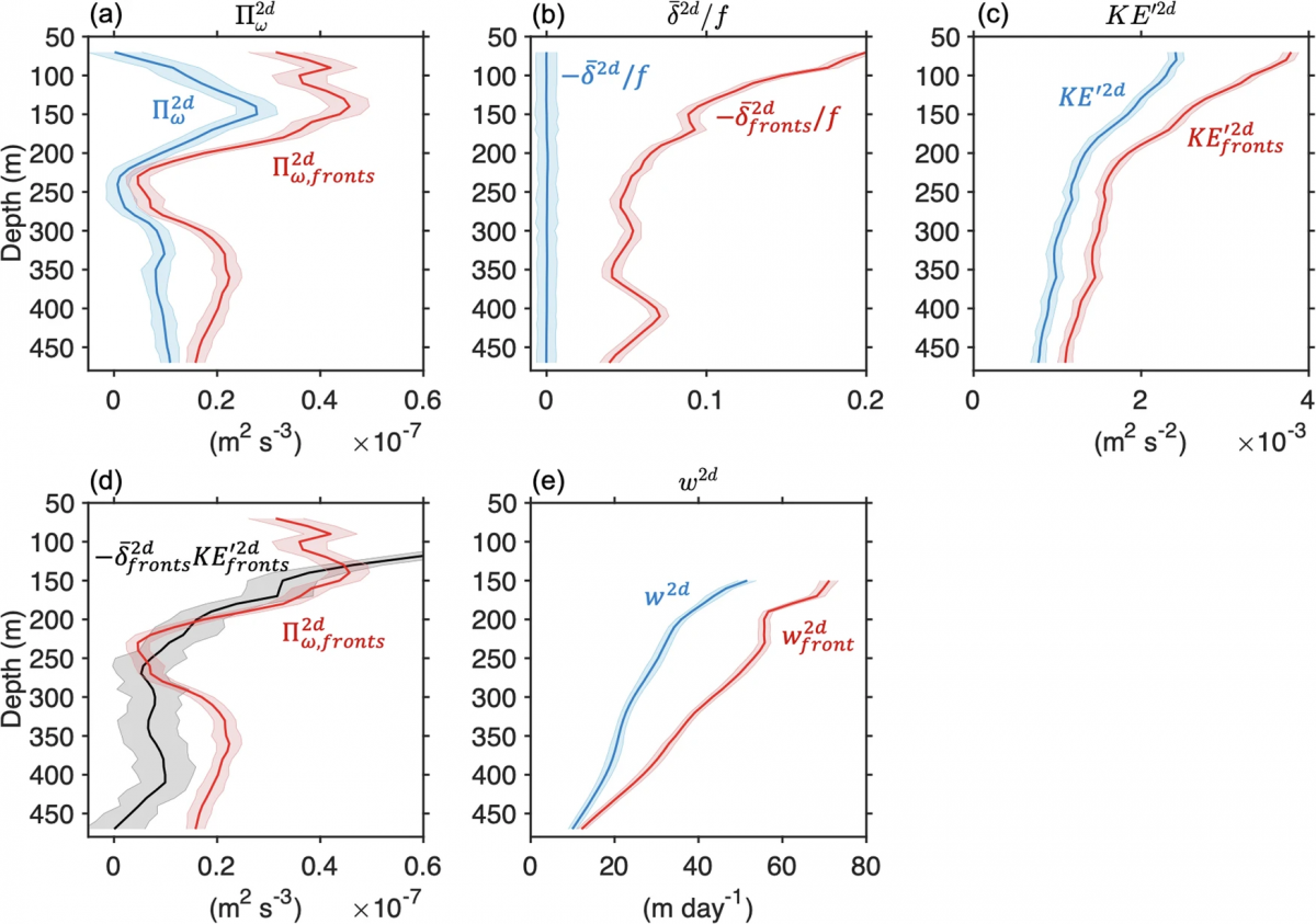 图2. 冬季亚中尺度锋生过程相关的正向能量串级。(a) 跨尺度能量通量、(b) 水平辐聚、(c) 水平动能和(e)垂向流速的深度剖面图,蓝线表示冬季平均,红线表示冬季锋面平均。图d揭示了跨尺度能量通量(红线)与水平辐聚和水平动能(黑线)之间的关系。阴影区域表示95%的置信水平。