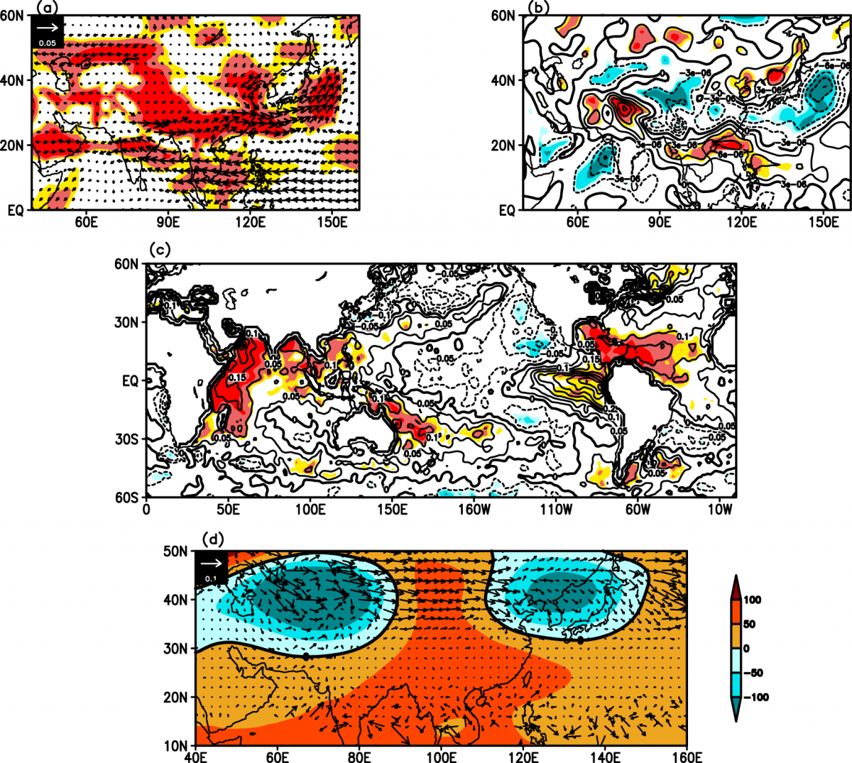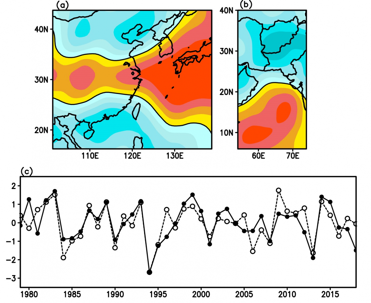 我院海洋大气相互作用研究团队针对阿拉伯海和伊朗高原的热力配置特征和异常情况及其与东亚夏季风年际变化的相关联性进行了系统性分析,结果显示阿拉伯海-伊朗高原的热力空间型态呈现出稳定的偶极型模态。当阿拉伯海的非绝热加热出现正异常,伊朗高原出现异常冷却时,中国的长江中下游地区、日本及其邻近海域的夏季降水显著高于气候态,华北和华南的沿海地区夏季降水量显著偏少(图1)。