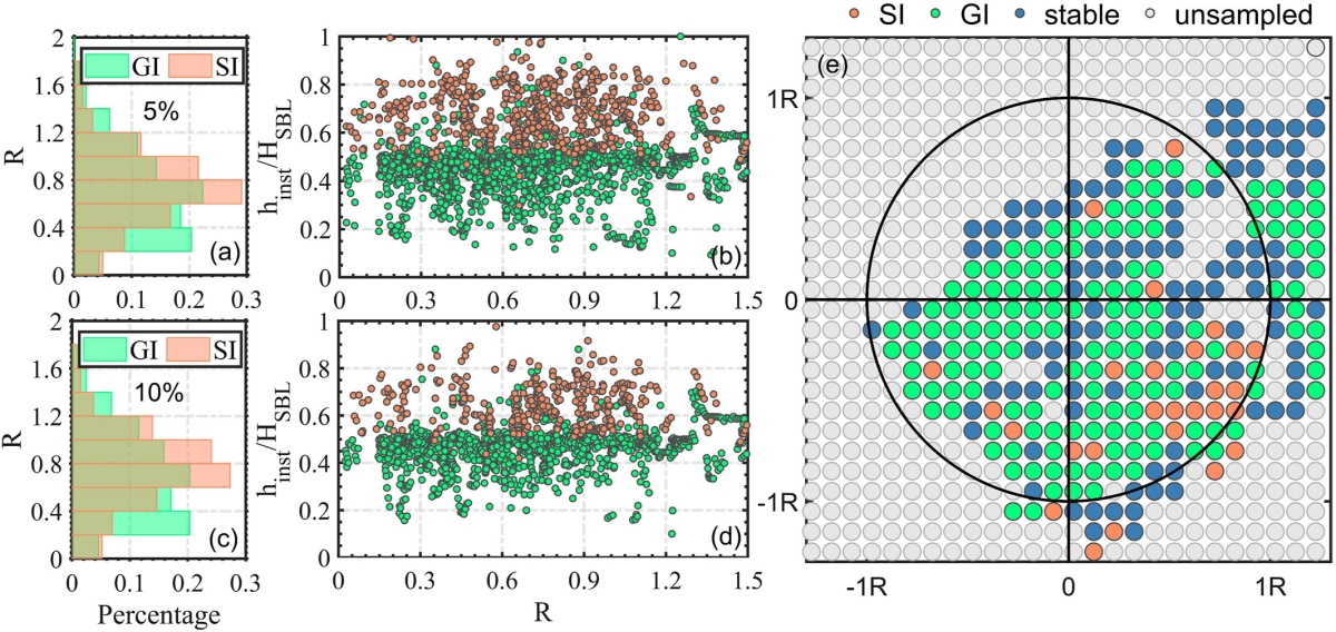 结果表明,在热带气旋“海棠”期间,亚中尺度不稳定的发生概率显著增加,对称不稳定和重力不稳定的概率是非热带气旋期间的两倍。热带气旋引起的热通量损失往往为重力不稳定的发展创造了有利条件。重力不稳定主要发生在涡旋的0.2-0.8半径范围内,且集中在混合层的上半部分。对称不稳定则倾向于发生在混合层的下半部分,主要分布在涡旋的0.6-1.0半径之间,并且主要集中在涡旋的东南边缘,在热带气旋“海棠”期间发生频率最高。亚中尺度不稳定的空间分布特征受锋面、热带气旋风场结构以及大气通量的共同影响。热带气旋诱发的风场促进了锋面区域负位涡(摩擦位涡通量)的注入,导致锋面更容易触发对称不稳定。此外,研究发现,在热带气旋过境期间,稳定的风场比旋转风场更有利于亚中尺度不稳定的形成。热带气旋伴随的强风应力打破了亚中尺度不稳定的昼夜循环,为中午期间本应较弱的亚中尺度不稳定提供了条件