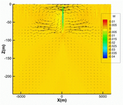我院海洋大气相互作用研究团队,基于湍流热成风原理,采用美国国家大气研究中心的大涡模拟模式,研究了海洋上混合层中亚中尺度冷涡丝的演化物理过程,旨在探究亚中尺度冷涡丝演化过程及其受控机制。研究发现,亚中尺度次级环流方向发生了周期性的改变(图1),这导致了亚中尺度冷涡丝的演化包含了锋生和锋消两个物理过程。