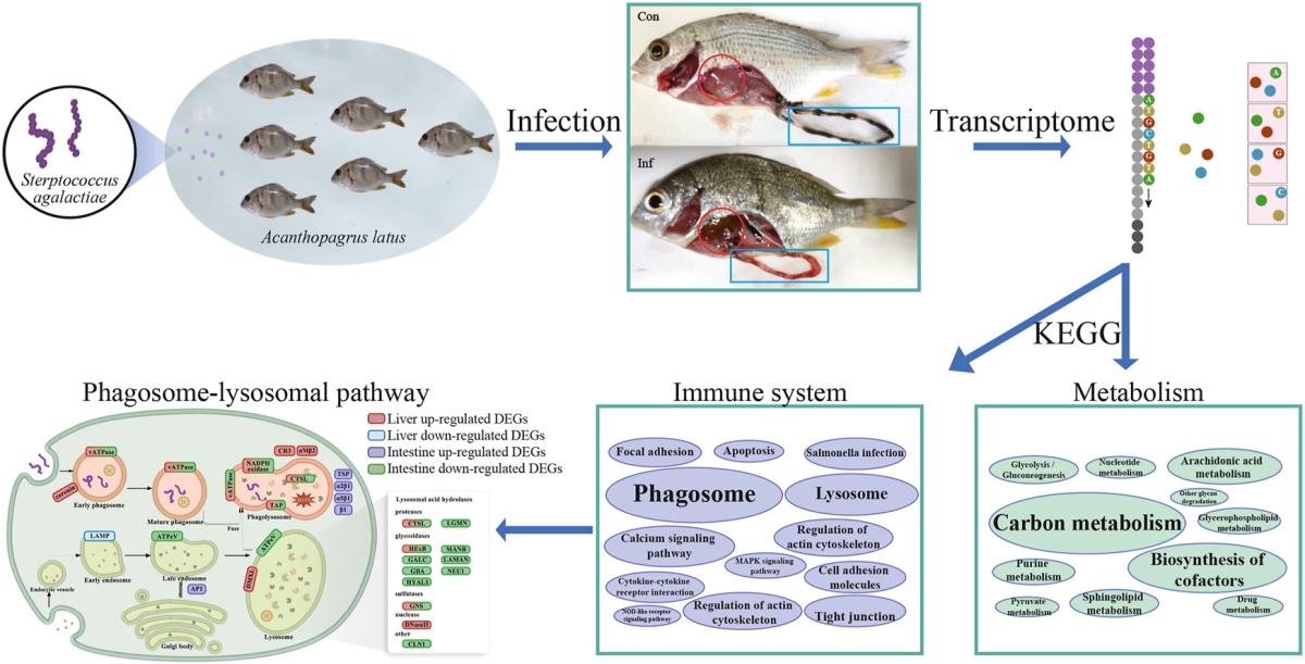 我院海洋生物有机地球化学研究团队联合广东省农业科学院黄文研究员团队,在建立无乳链球菌感染黄鳍鲷模型的基础上,通过临床症状观察、组织学分析、血清生化指标检测、免疫相关酶水平测定和转录组分析(图1),揭示了无乳链球菌感染对黄鳍鲷的影响及其免疫应答机制。研究结果表明,无乳链球菌感染对黄鳍鲷的肝脏、肠道、鳃和脾脏造成了明显的损伤和代谢紊乱,免疫相关酶水平显著升高。黄鳍鲷通过激活吞噬体、溶酶体、细胞粘附分子及细胞因子——细胞因子受体相互作用等关键免疫途径,对无乳链球菌感染做出显著应答。免疫相关基因ctsl,atp6v0a,tap,lamp,itgb,il12,tnf和cxc可能在黄鳍鲷的免疫调节中发挥关键的作用。这些发现为揭示黄鳍鲷感染无乳链球菌后的分子免疫机制提供了关键依据,同时为其疾病防控和分子育种奠定了重要基础。