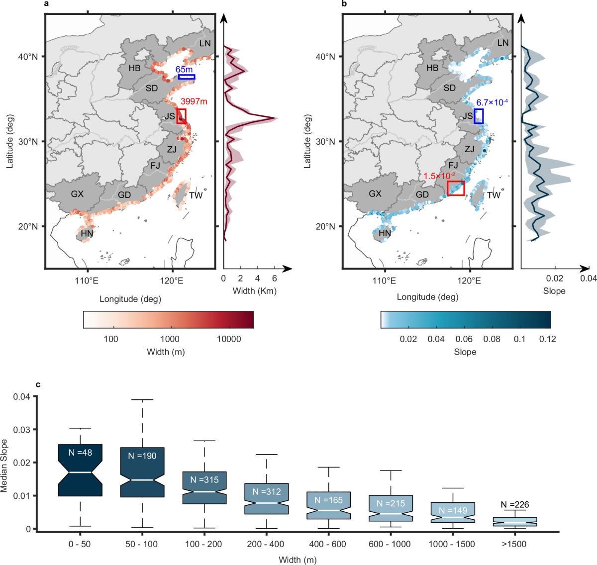 图1 中国潮滩宽度和斜率空间分布,以及两者之间的关系
