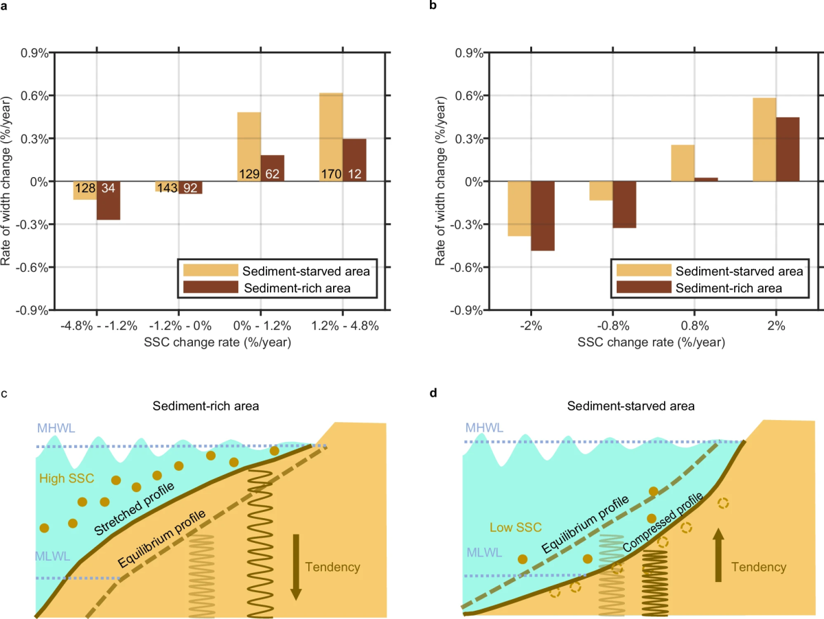 潮滩作为全球重要的海岸生态系统,在防洪减灾、碳封存和生物栖息地维持等方面发挥关键作用。其大尺度动力地貌演变机制尚未明确,而近40年全球潮滩面积锐减16%的现状更凸显研究的紧迫性。本研究通过分析中国海岸2538个潮滩断面的地貌数据与环境参数(图1),揭示潮滩形态的时空分布规律:潮滩宽度与悬浮泥沙浓度(SSC)呈显著正相关,而坡度主要受潮差控制。2002-2016年全国潮滩宽度下降,与同期SSC减少的趋势密切相关。研究进一步发现富泥沙和寡泥沙潮滩对SSC变化的响应存在显著差异,富泥沙潮滩在SSC下降时侵蚀更快,而寡泥沙潮滩在SSC增加时恢复速率更快(图2)。富泥沙潮滩如被拉伸的弹簧,在沉积物减少时快速收缩至平衡态;寡泥沙潮滩如被压缩的弹簧,在沉积物输入增加时快速回弹至平衡态。该现象同样发现于印度尼西亚、美国和澳大利亚等国家的潮滩海岸系统,进一步证明其全球普适性。基于潮滩地貌动态平衡解析模型(DET-ESTMORF),驱动潮滩弹性响应的机制可解释为:模型中潮滩的冲淤受实际泥沙浓度与局部平衡浓度的差异所驱动,当泥沙供给减小时,无论富泥沙和寡泥沙潮滩的平衡浓度都随之降低,但富泥沙区的降低相对寡泥沙区而言更小,导致泥沙供给变化与平衡浓度变化的差异更大,进而出现更明显的侵蚀后退。相反,当泥沙供给增加,富泥沙和寡泥沙潮滩的平衡浓度都随之增加,但寡泥沙潮滩的平衡浓度增幅小于富泥沙潮滩,导致实际其泥沙供给与平衡浓度的差异更大,从而呈现更明显的淤积趋势。该研究为理解大尺度潮滩地貌变化,优化海陆泥沙调配策略提供理论支撑。