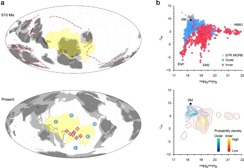研究推测,Caroline地幔柱的年轻再循环地壳组分可能来自围绕正在裂解的Rodinia超大陆俯冲带(图3)。一次大规模的环Rodinia俯冲事件即可解释它们在分布上相隔遥远却有共同特征的现象(图3)。由于Caroline、Hawaii和Galapagos地幔柱都位于太平洋LLSVP的外环边界附近。该研究将该地幔柱热点按分布位置分为两组,一组是边缘“外圈”热点,另一组是中心“内圈”热点。其中,“外圈”OIB缺乏“内圈”OIB表现出的极端地幔端元组成;“外圈”OIB相较于“内圈”OIB在Nd-Hf同位素图上整体呈现偏向亏损地幔(DM)端元的密度分布。据此,研究推测:来源于LLSVP边缘的地幔柱更容易携带较多的年轻、具有亏损同位素组成的洋壳,而中心地区则富含古老物质。这一分布格局也可能源于当时的大规模环Rodinia俯冲事件。