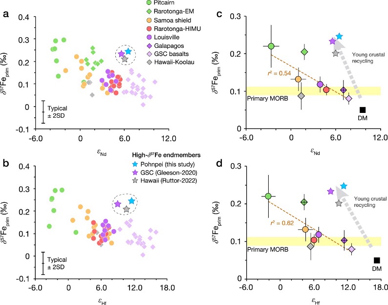 研究结果显示,高MgO(>8 wt.%)Pohnpei玄武岩的δ57Fe值为0.13 - 0.21‰,显著高于地幔值(δ57Fe = 0.05 ± 0.01‰;),指示Pohnpei源区存在一个高δ57Fe组分(再循环的洋壳)。研究发现,高δ57Fe的再循环地壳组分广泛分布在太平洋LLSVP内,包括Pitcairn、Rarotonga和Samoa等在内的多个地幔柱。为了进一步探讨Caroline地幔柱中高δ57Fe组分的性质,该研究分析了太平洋LLSVP地幔柱玄武岩δ57Fe与Nd-Hf同位素的相关性。如图1所示,不同地点(Pitcairn、Rarotonga、Samoa、Louisville、Galapagos及Hawaii)的OIB在同位素组成平均值之间具有明显相关性。另外,具有富集地幔(EM)端元特征的玄武岩(如Pitcairn、Rarotonga和Samoa)处于这些相关趋势的极端位置,这也符合EM端元来源于更古老再循环地壳的观点。