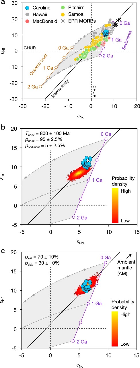 Pohnpei玄武岩富集重Fe同位素同时中度亏损Nd-Hf同位素的组合,反映源区中掺入了年轻洋壳,因为年轻洋壳形成时间短,尚未累积长期的放射性成因同位素特征。该研究进一步采用Monte-Carlo方法对俯冲板片的Nd-Hf同位素组成进行模拟计算(图2),结果显示,该年龄的洋壳及沉积物的混合可以成功重现Caroline玄武岩中度亏损的Nd-Hf同位素组成,并且观测数据与模型的高概率密度区高度重叠。