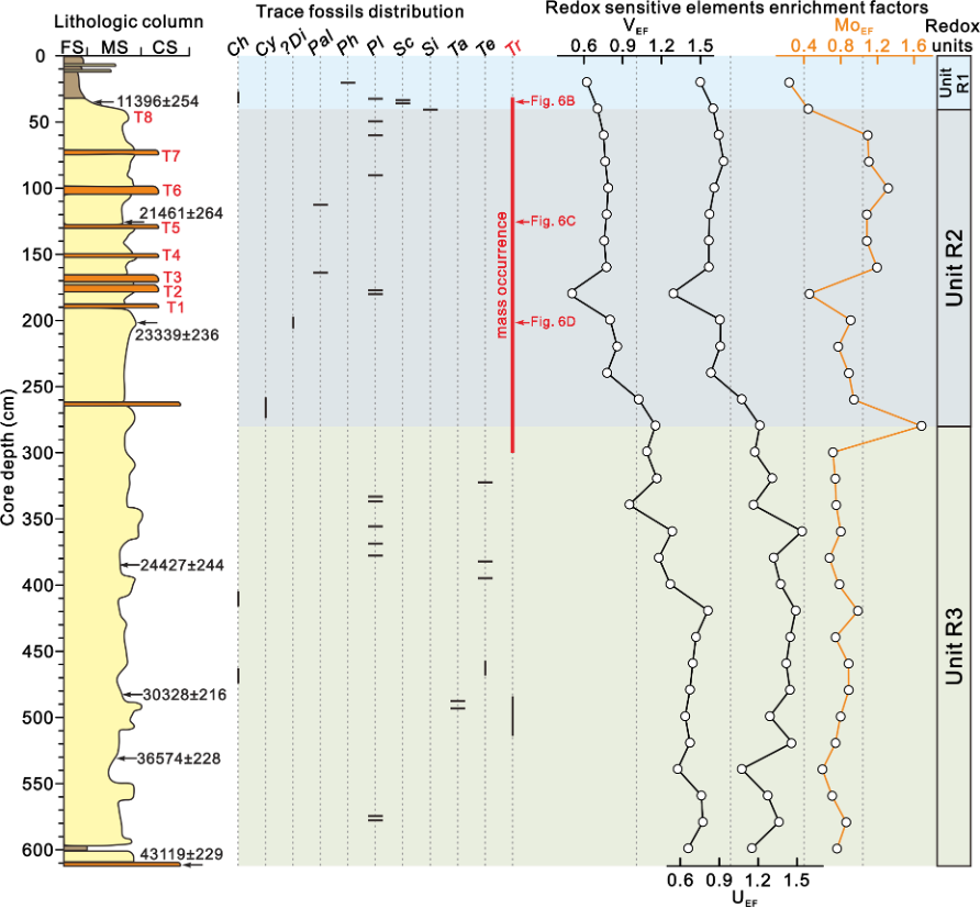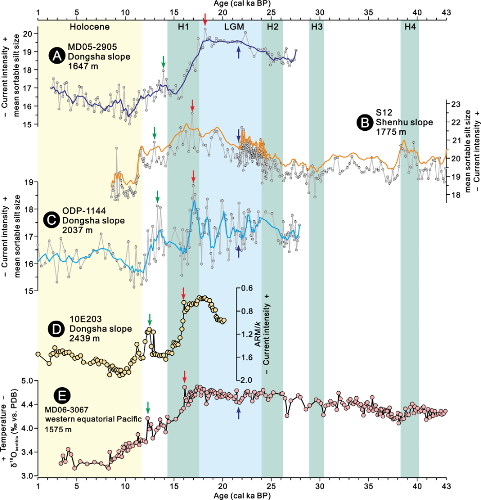 南海深层水团是由“北太平洋深层水”从吕宋海峡进入南海而形成的气旋式水团。前人的研究一致认为,进入南海的“北太平洋深层水”主要是来自于南大洋的环南极上层深层水团,但对冰期时(尤其是海因里希期)通风增强的北太平洋中层水是否进入南海并成为南海深层水的一部分这一问题仍存在争议。针对这一科学问题,我院深水沉积过程与资源效应团队以南海北部神狐陆坡1776米水深获取的6.1米柱状沉积物为研究样品,结合有孔虫碳同位素定年、基于CT扫描的古生物遗迹识别、沉积物粒度分析和氧化还原敏感元素分析的综合研究方法,重建了南海深层水团4.3万年以来相对流速和含氧量变化历史。