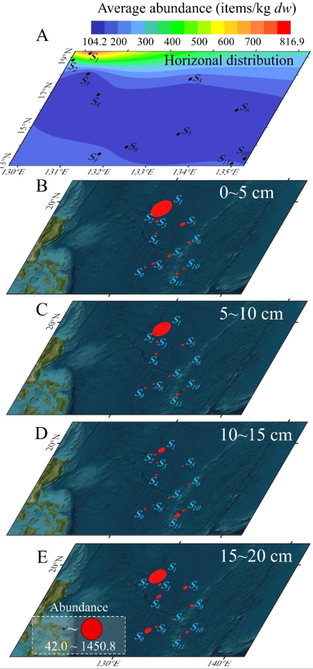 图3: 菲律宾海深海沉积物中微塑料的水平和垂直分布模式