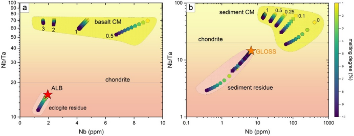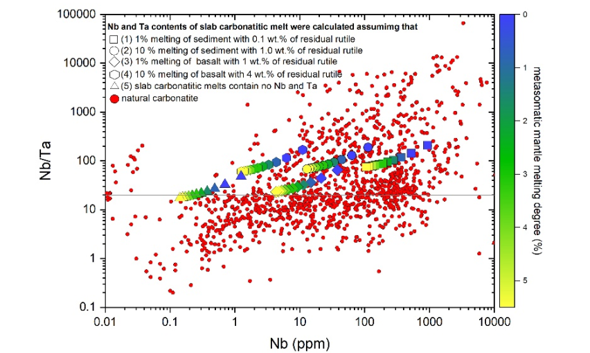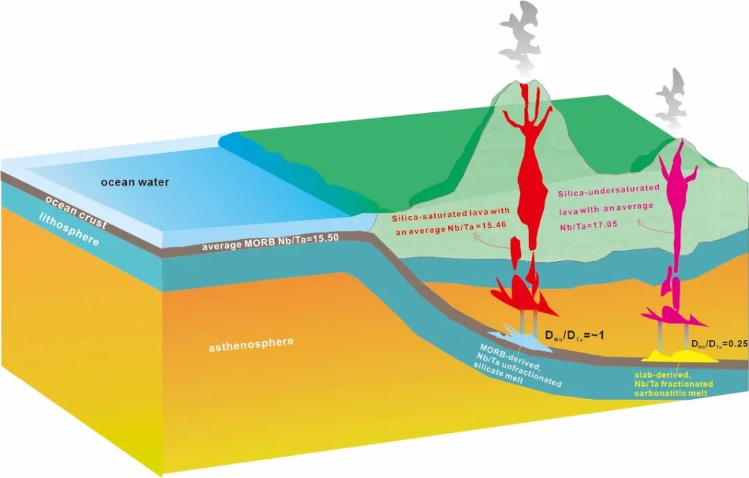 研究还发现在俯冲带温度条件下碳酸盐熔体比硅酸盐熔体对Nb/Ta的分异能力更强,碳酸盐熔体加入可以显著提高地幔楔的Nb/Ta值。同时,数据统计发现俯冲带原始硅饱和火山岩Nb/Ta与洋中脊玄武岩(MORB)一样,而硅不饱和火山岩Nb/Ta比MORB高1.5。