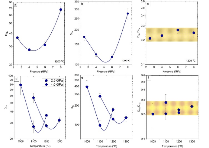对此,我院海洋岩石地球化学与深部物质循环研究团队主导开展了高温高压实验模拟研究,分析了2.5-8万个大气压、1000-1300℃条件下Nb和Ta的分配行为,结果发现DNb和DTa随温度和压力的增加先降低后升高,但DNb/DTa几乎不受温度和压力的影响,保持在0.25附近(图1)。