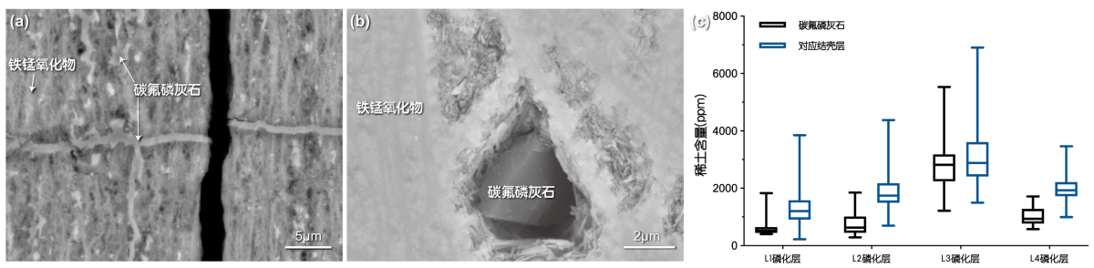 1. 磷酸盐化在结壳中引入了新的稀土赋存载体——自生CFA (图3)。但不同期次事件形成的CFA,其稀土含量差异显著,研究发现结壳的磷化层的REY含量(1293 ppm)低于上覆的未磷化层(1413 ppm)。原因是该期次事件沉淀了“贫稀土”的CFA(REY含量仅602 ppm),从而对该层位起到了“稀释”作用。与之相对,缓慢形成的富稀土脉状CFA(REY含量可达2703 ppm)则起到了“促进”作用。
