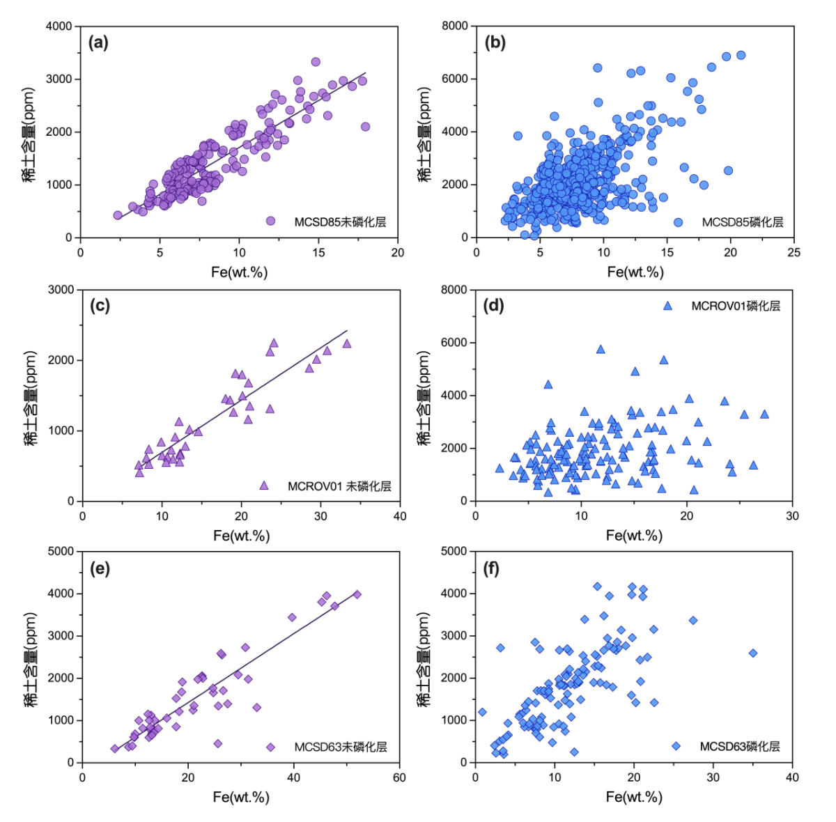 2. 磷酸盐化事件也改变了原有稀土载体——铁(氢)氧化物的富集机制。一方面,CFA成为稀土的重要贡献者,甚至可能超越了铁(氢)氧化物,导致磷化层中REY与Fe的相关性显著减弱(图4);另一方面,高磷环境还会通过协同吸附,提高铁(氢)氧化物本身对稀土的吸附能力。