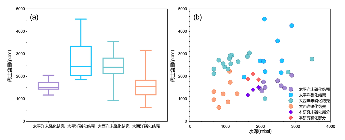 3. 磷酸盐化事件对结壳稀土的影响受到沉积环境的严格控制,除了CFA本身的沉积速率影响其对稀土的富集外,水深也是一个重要的背景因素(图5),更深的水体因其海水中REY的背景浓度更高,能为结壳的稀土富集提供更有利的物质来源。