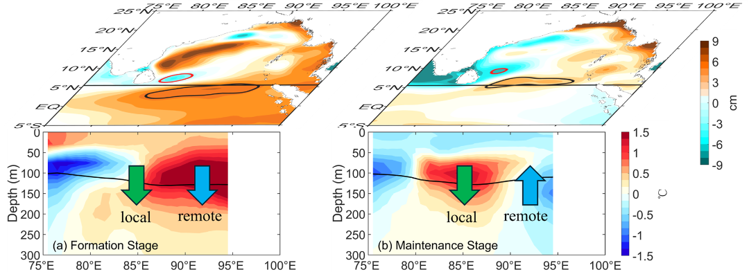 在形成阶段(6月),赤道强迫的半年周期Rossby波与局地负风应力旋度激发的年周期Rossby波的正位相信号叠加,导致全海盆温跃层加深;在维持阶段(7-9月),局地强迫保持正位相而赤道遥强迫转为负位相,这种位相差异造成温跃层东西不对称分布——西部由强的正位相局地强迫维持加深状态,东部则受负位相的遥强迫主导而出现温跃层抬升(图2)。该研究揭示了局地-年周期Rossby波与远程-半年周期Rossby波的复杂干涉机制,为提升孟加拉湾南部海洋次表层季节性预报能力提供了新的理论依据。
