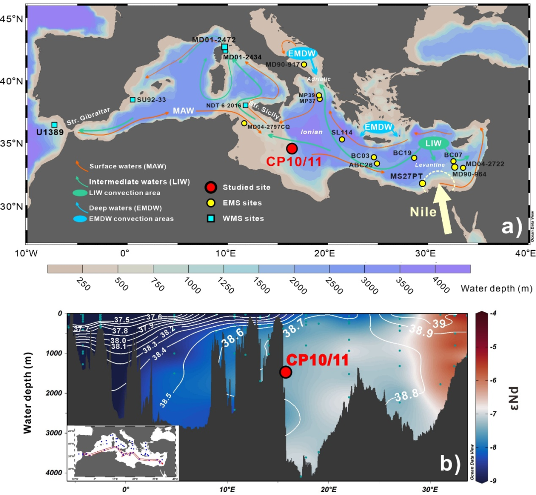 地中海因半封闭海盆特性及较短的环流混合时间(75–150年),其温盐环流对气候变化高度敏感并且快速响应:近70余年西地中海深层水变暖记录以及上世纪90年代观测到东地中海深层水形成位置改变均为明证。地中海环流变化可影响甚至改变大西洋经向翻转流(AMOC)的强度与模态,且与腐泥层(sapropel)形成直接相关。腐泥层是富含有机质的页岩沉积,可通过海洋沉积物或海相地层追溯到中中新世(更多出现在东地中海),其沉积呈现特征天文韵律,只形成于岁差极小值期,对应北半球夏季太阳辐射量最大值及非洲季风活跃期。腐泥层形成通常指示了底层水体缺氧,这与深层通风减弱和表层生产力增强有关。这些过程背后的主要驱动因素是表层水体的相对淡化。然而,在不同气候条件下,地中海环流对淡水强迫的响应敏感性仍不明确,尤其是在淡水来源、海平面及海盆差异等方面。