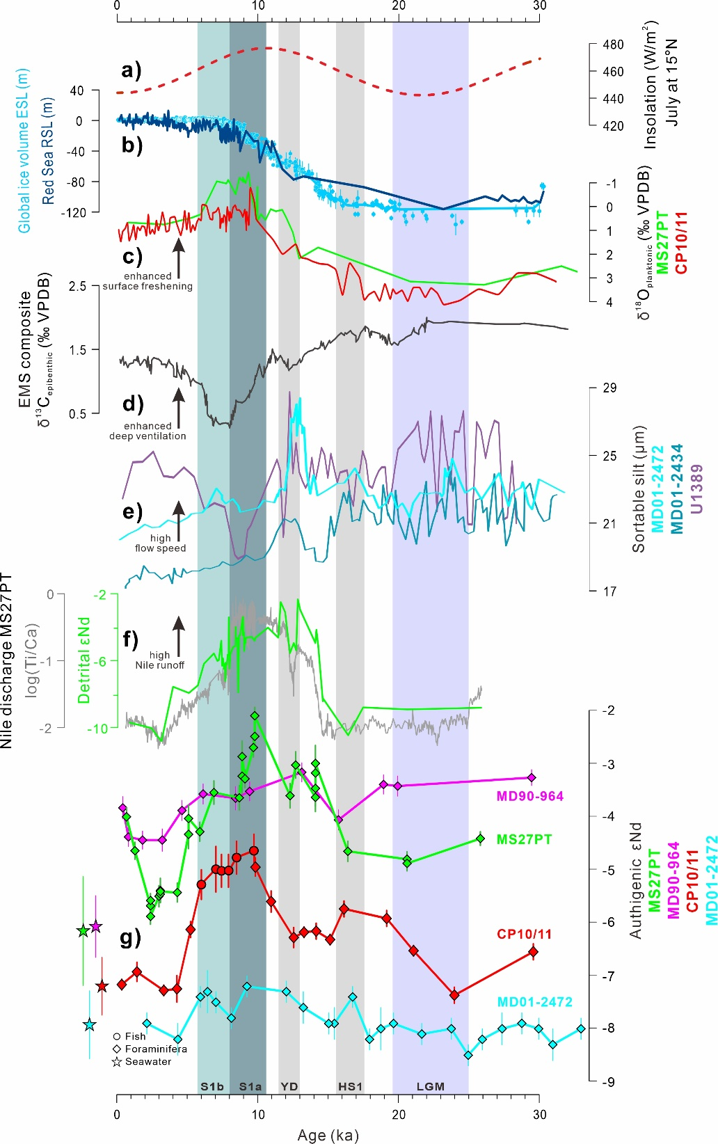 图2. 东地中海深层水εNd记录(CP10/11站位)与其他指标记录对比图,指示了该记录的变化受控于高εNd尼罗河输入端元与低εNd大西洋表层水输入端元的平衡关系。