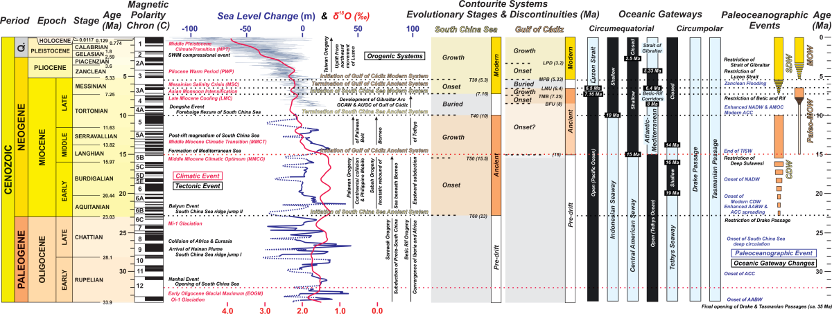 图4南海和加的斯湾古代及现代漂积体系的演化阶段与主要的全球性变化事件对比