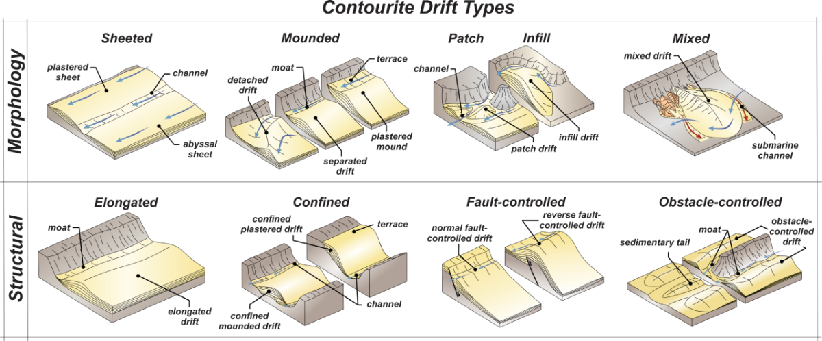 底流沉积体系在全球范围内呈现显著的构造相关性(图1)。本文总结了底流沉积体系的几何形态、内部反射特征与叠加方式,提出修订后的漂积体分类方案(图2)。通过构建漂积体形态与典型侵蚀标志的对应关联,将底流漂积体划分为限制型、断控型和障控型三类,并从构造背景、海底地形及底流动力的角度分析其演化差异(图3)。