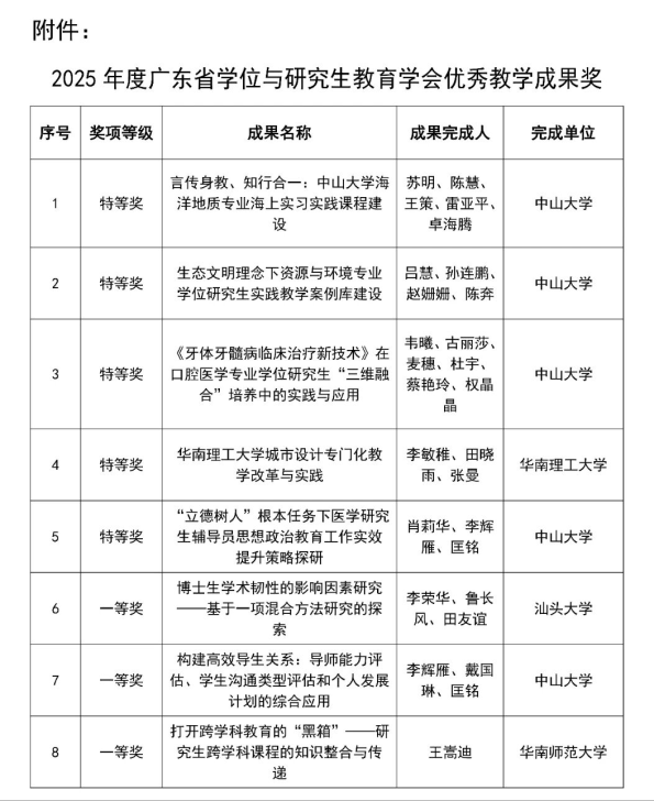 近日,2025年度广东省学位与研究生教育学会优秀教学成果评审结果揭晓,我院苏明教授团队申报的《言传身教、知行合一:中山大学海洋地质专业海上实习实践课程建设》成果被评为广东省学位与研究生教育学会优秀教学成果特等奖。