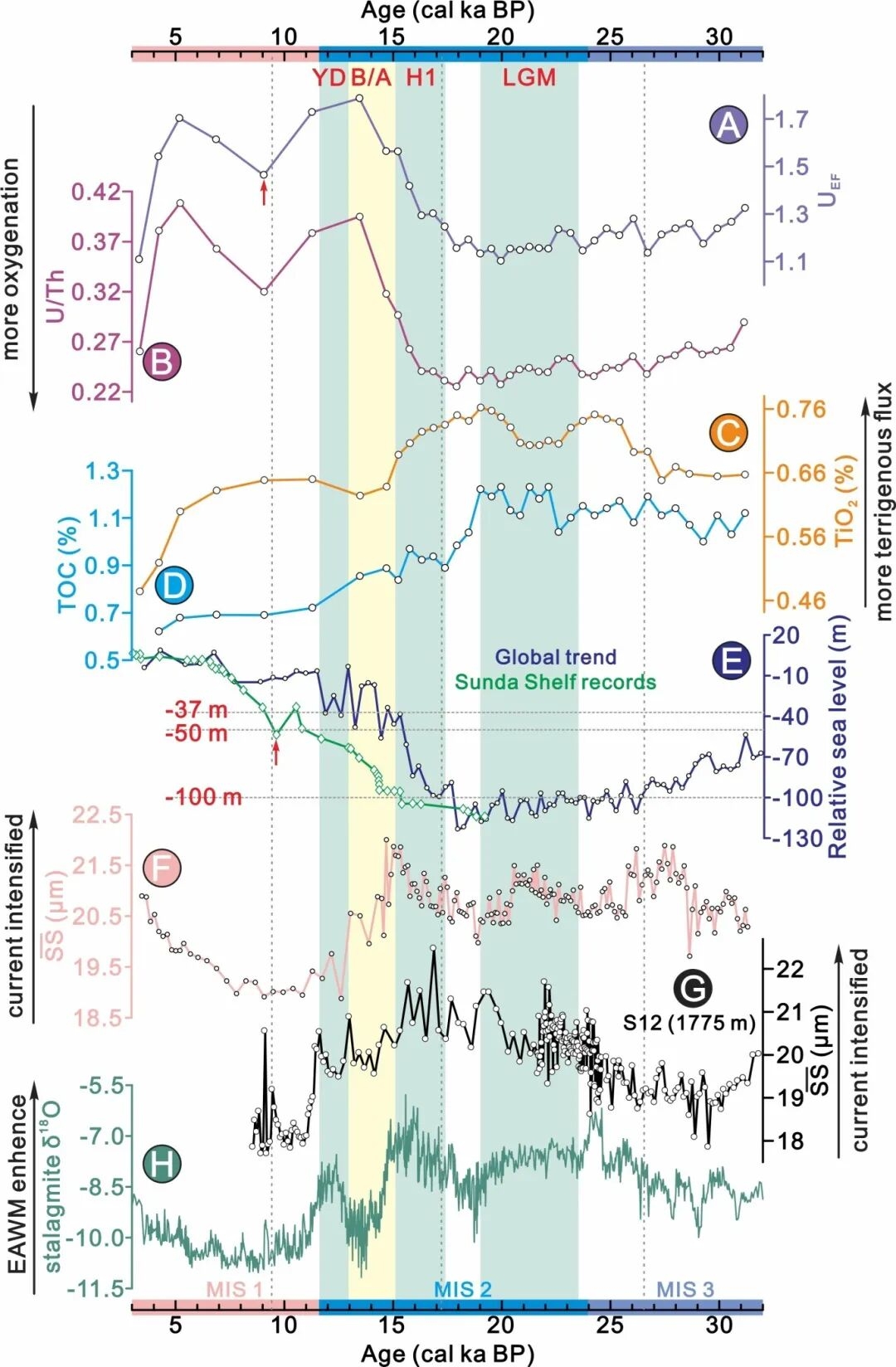 通过氧化还原敏感元素、古生物遗迹种属及其分布、陆源碎屑矿物含量及TOC含量变化的综合分析(图2),本研究克服了高陆源碎屑供给背景下氧化还原元素指标的局限性,重建了可靠的南海中层水末次冰期以来氧化还原性质变化历史。另外,以可分选性粉砂平均粒径为水团流速的代用指标,重建了南海中层水的流速变化历史。结果显示,冰期南海中层水表现为相对高流速、高含氧量特征,全新世则转为相对低流速、低含氧量特征。通过对比南海表层和深层水的变化历史及其潜在的控制机制,本研究认为,冰期时海平面下降在不同程度上阻断南海表层水从卡里马塔海峡(< 37 m)、台湾海峡(< 50 m)和巴拉巴克海峡(~100 m)外流,进而迫使富氧、高盐、温暖的南海表层水下沉,表层水对中层水的贡献增加有效增强了中层水的通风强度(图3和4)。该过程使冰期时的南海中层水相较于间冰期具有更高的温度、盐度、流速和含氧量,也可能增加了南海中层水的外流通量。