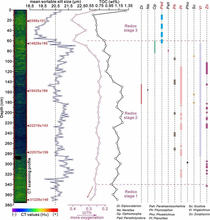 南海中层水是南海低氧水团,于南海南部和西部由上升的深层水和下沉的表层水混合而成,随后通过吕宋海峡外流融入北太平洋中层水(图1)。南海中层水的运动模式与地中海溢出流相类似,但南海中层水是否具有与地中海溢出流调控北大西洋经向翻转环流强度相类似的功能尚不清楚。此外,对于南海中层水冰期–间冰期的演化特征及其差异的认知仍然匮乏。针对以上科学问题,深水沉积过程与资源效应团队以南海北部陆坡751米水深获取的柱状沉积物为研究样品(图1),结合有孔虫定年、沉积物粒度、TOC、氧化还原敏感元素和古生物遗迹特征的多指标综合研究方法,重建南海中层水末次冰期以来相对流速和氧化还原性质变化历史,初步厘清该水团冰期–间冰期海平面变化背景下的演化格局,旨在建立进一步研究的基础理论框架。