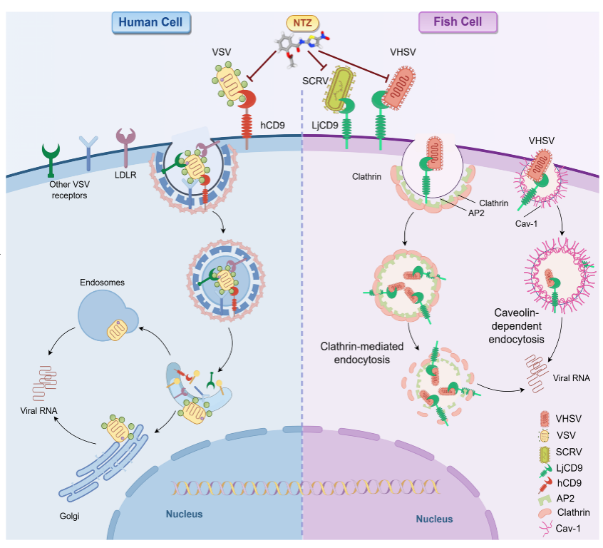 本研究首次鉴定出四次跨膜蛋白CD9是跨属弹状病毒入侵宿主的“通用钥匙孔”,并证实已上市药物硝唑尼特(NTZ)有望成为防治此类病毒的广谱药物,为水产养殖、畜禽疫病及相关人畜共患病防控提供全新理论基础与应用方案。