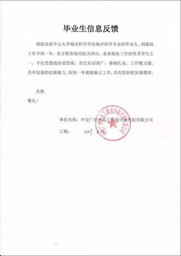 2013届毕业生万蕊雪(现为清华大学博士后),迄今已经作为共同第1作者在《Science》发表论文9篇(其中3篇排位第一),在《Cell》发表论文2篇,入选2016年“未来女科学家计划”;2015届毕业生刘耀,任职于国家外交部地区业务司;2016届毕业生张宁远,前往美国斯坦福大学环境工程专业深造;2015届毕业生节晓宇和2017届毕业生漆添被英国帝国理工学院录取,…… 中交广州水运认为,“(我院毕业生)基础扎实,工作能力强,具有较强的创新能力。”