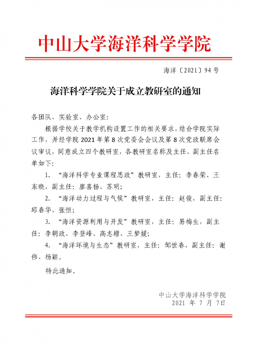 海洋〔2021〕94号 太阳成集团tyc9728关于成立教研室的通知
