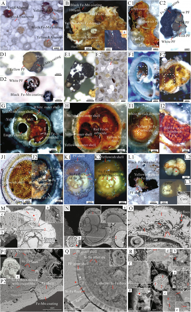 我院孙晓明教授研究小组博士生陈宪等对西南印度洋中脊尚在活动的龙旂热液区附近表层沉积物S29-16中的钙质软泥开展了研究。前人通过全岩MSI指数认为它属于非含金属沉积物,但此次研究中,陈宪等通过系统分析钙质软泥中有孔虫壳层微观形态(图1)以及Si-(Fe) 氧化物、Fe-Mn结皮和蚀变有孔虫壳体之间的共生序列及其相关性(图2)等,发现该沉积物其实是存在热液活动信号(Si-Fe沉积)的,只是被后期形成的富稀土的水成自生组分(Fe-Mn结皮)所掩盖了,导致全岩分析方法难以鉴别,进而得出该沉积物属于非含金属沉积物的错误结论。因此我们的研究结果发现: 借助全岩分析方法,利用沉积物进行热液活动示踪的时候需要谨慎,可能会忽略掉被掩盖了的热液信号。