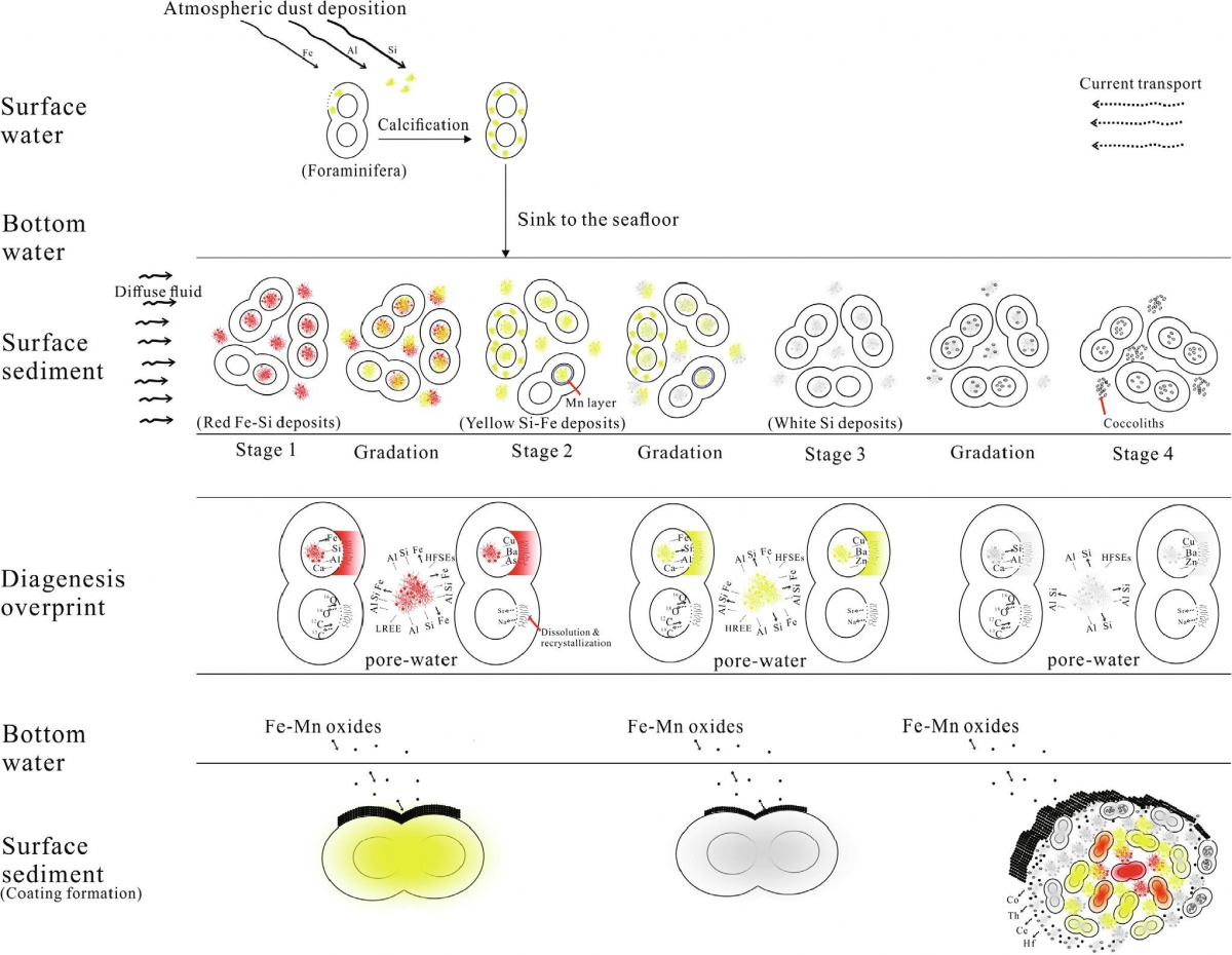 此外,本研究首次利用高精度LA-ICP-MS面扫法揭示了热液活动加速沉积物发生成岩作用的机制:广泛扩散的热液流体所形成的热液产物可通过元素释放方式(矿物溶解-重结晶)对沉积物进行成岩改造,并促进和参与水成Fe-Mn沉积过程。
