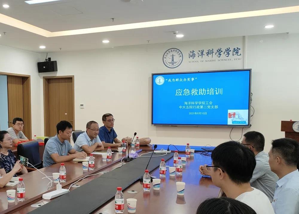 时值第37个教师节,为普及应急救助知识,提高师生安全意识和自救互助能力,9月10日上午,我院邀请中山大学附属第五医院的医护人员,为我院师生举办了一场以心肺复苏术和自动体外除颤仪(简称AED)使用为主题的应急救助培训。培训由中山大学附属第五医院党委书记林伟庭带队、行政二党支部和急危重症医学部党支部党员医护人员主讲。我院党委书记李春荣、党委副书记廖喜扬、工会副主席贾坤同副教授及30余名师生参加了此次培训。