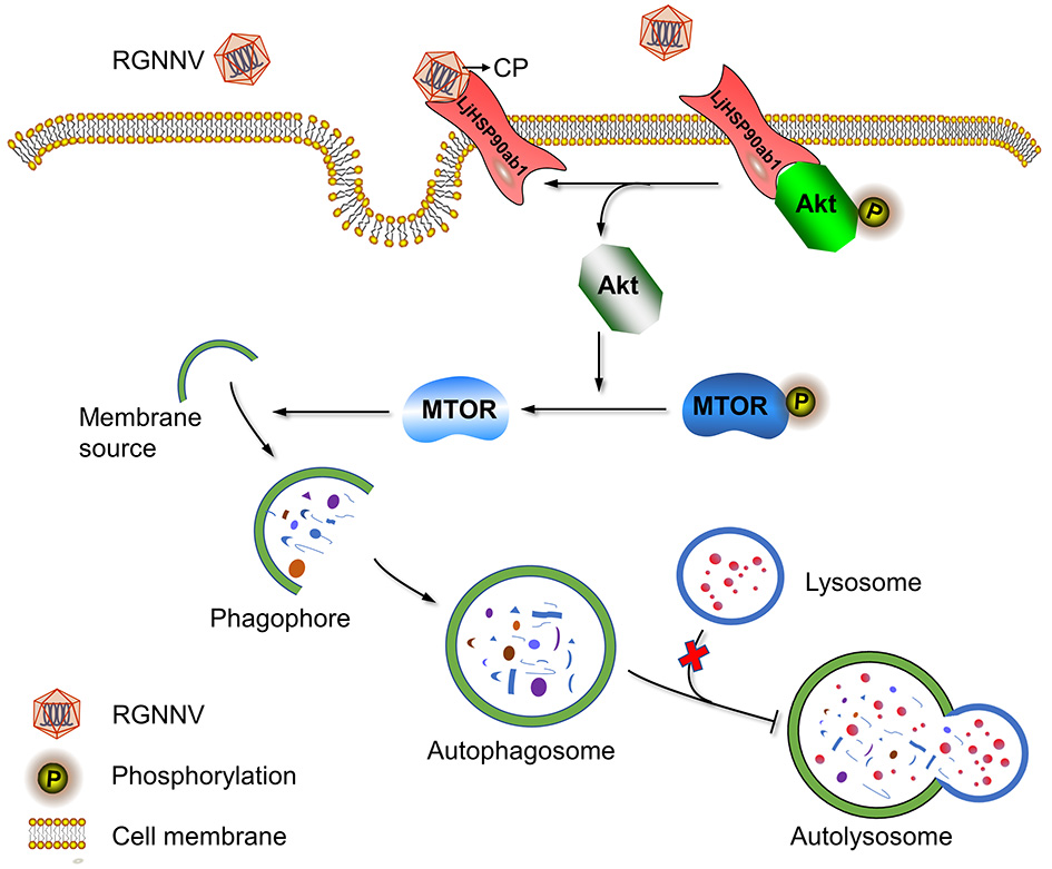 神经坏死病毒(nervous necrosis virus, NNV)是一种广泛流行,严重危害多种海水和淡水鱼类的传染性病原体,给世界海水渔业造成巨大经济损失。我院海洋生物技术与遗传资源研究团队曾报道过NNV的新受体-热休克蛋白90ab1(heat shock protein,HSP90ab1),并揭示NNV介导HSP90ab1入侵宿主细胞的分子机制(PLoS Pathogens, Marine medaka heat shock protein 90ab1 is a receptor for red-spotted grouper nervous necrosis virus and promotes virus internalization through clathrin-mediated endocytosis, 2020)。现有研究表明,NNV能够诱导鱼类细胞发生自噬促进自身复制,但NNV在入侵阶段诱导细胞自噬的分子机制仍不清楚。