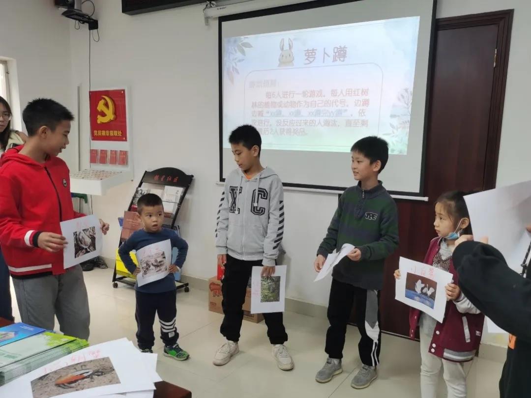 游戏往往最能吸引小朋友们。第一个游戏是“萝卜蹲”,志愿者们也加入小朋友的队伍中与他们一起游戏,大家都选择了一种红树林常见的动植物作为自己的“代号”。