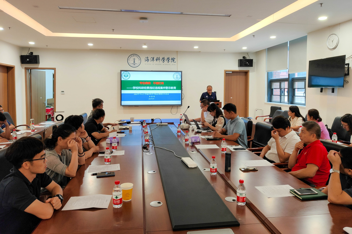 学院党委李春荣书记以“守住底线 不越红线”为主题,开展学校科研经费违纪违规案件警示教育。李春荣书记从科研经费管理制度、科研经费违纪违规案件的形势、科研经费违纪违规案件的主要表现形式、违纪违规案件背后的原因等方面对近年科研经费违纪违规案例进行了剖析通报,明确了科研经费使用纪律红线,要求全体师生员工强化遵规守纪意识、廉洁自律意识和接受监督意识,牢牢守住底线、不越红线,共同营造好风清气正的教学科研环境,为学校“双一流”建设和海洋学科建设提供坚强的纪律保障。