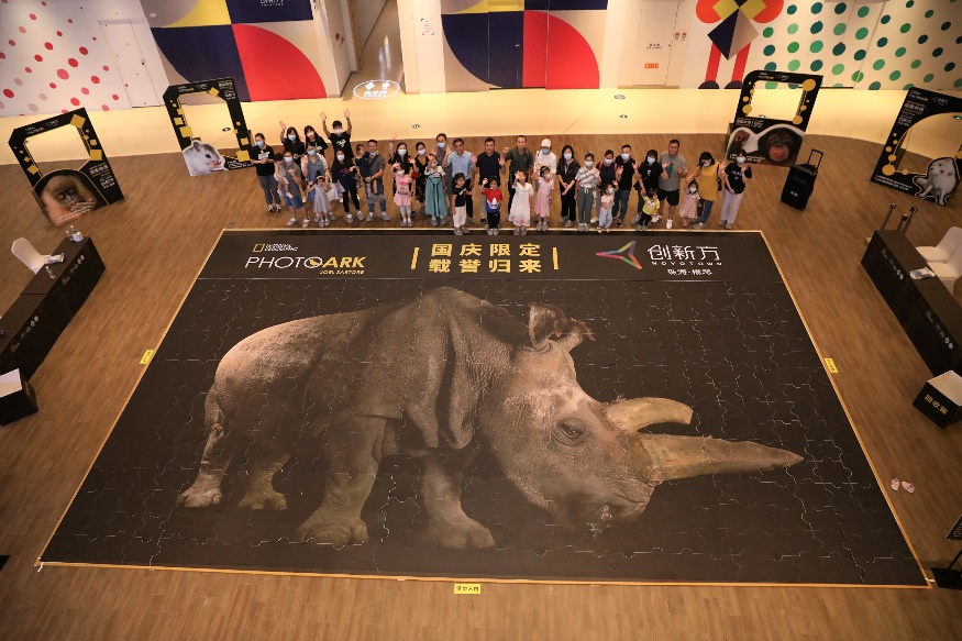 为了能在全球濒危野生动物消失前,留下它们珍贵的影像,从而引起人们的关注,帮助这些动物更好的繁衍,不用面临灭绝的厄运。当日,100名市民游客还参与了一项特别的活动——“拼图重现全球珍稀动物”。以实际行动,守护所见。活动开始后,游客的参与热情高涨。无论是成年人还是小朋友,大家都专心致志地拼图。他们时而眉头紧缩、时而恍然大悟,但不变的是专注的神情和高涨的热情。看着一张张碎片拼图在自己的手中慢慢成形,大家都非常开心。在市民和游客共同努力下,600多块碎片最终合为一体,全球仅剩2只的巨型“北白犀”肖像之一完美地呈现在了大家的眼前,画面壮观。