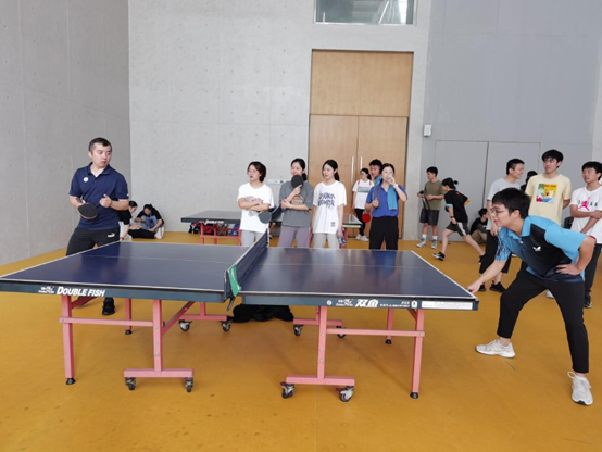 2017年,我们就常常在新体育馆打球,相互切磋球技。当时打球最大的目的有2个:减肥和微信步数。也在那个时候,我、车英浩和黄震宇就想组织学院的乒乓球师生赛,但是直至二人毕业,都没成功。2018年,小孩出生的第一年,我还坚持每晚去体育馆,约着英浩和佳名打球到球馆关门。2019年,英浩和震宇毕业了,家庭和工作的事情增多,加上自己的惰性,中断了打乒乓球的习惯。这一断就是三年,心爱的球拍在静静地发霉。