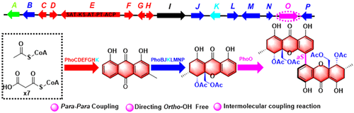 我院刘岚教授研究团队利用培养基优化、生物信息学分析、RT−qPCR分析和Crispr\Cas9基因敲除等方法,在一株海洋真菌Diaporthe sp. SYSU-MS4722中确定了PXA的生物合成基因簇(图1),并利用米曲霉Aspergillus oryzae NSAR1作为异源表达宿主对PXA的生物合成进行了解析。在该异源表达宿主中逐步表达14个基因,发现非还原性聚酮合酶(PhoE)和后修饰酶PhoCDFGHK主要负责聚酮骨架的构建和催化大黄酚(chrysophanol)的生成。转染基因phoBJKLMNP后发现,在Aspergillus oryzae中可以获得单体氧杂蒽酮penexanthone B,表明后修饰酶PhoBJKLMNP是催化大黄酚产生penexanthone B的重要合成途径(图1)。