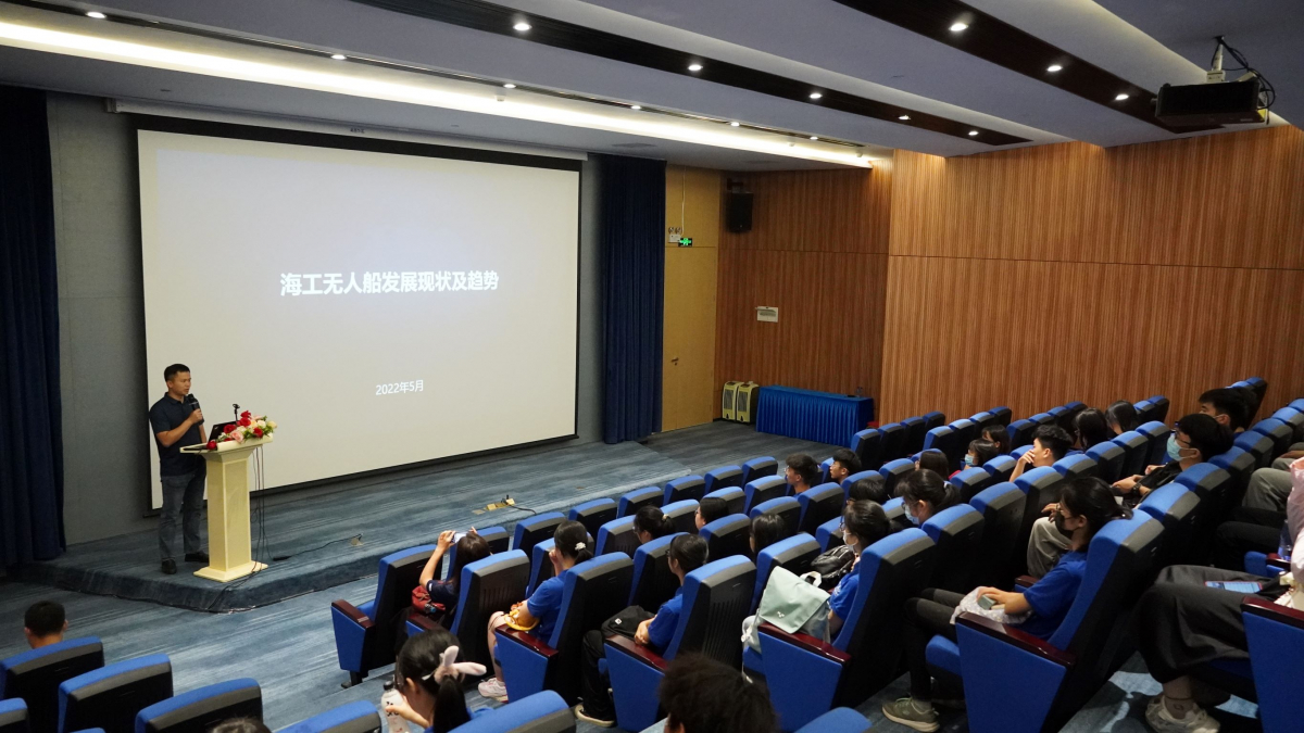 在黄志清总经理的讲解下,同学们参观“云洲”公司展厅,了解中国无人船发展历史和技术发展现状,学习无人船在环境测量、海洋调查、安防救援、智能船舶等领域的应用知识。在中国第一个无人船艇产业基地——香山海洋科技港码头,黄经理为同学们进行无人船实船介绍,介绍海洋调查无人船、走航监测无人船等无人船平台及其搭载的仪器设备。随后同学们前往报告厅,认真听取唐梓力总经理作《海工无人船发展现状及趋势》报告,师生就无人船技术应用进行深入交流探讨。