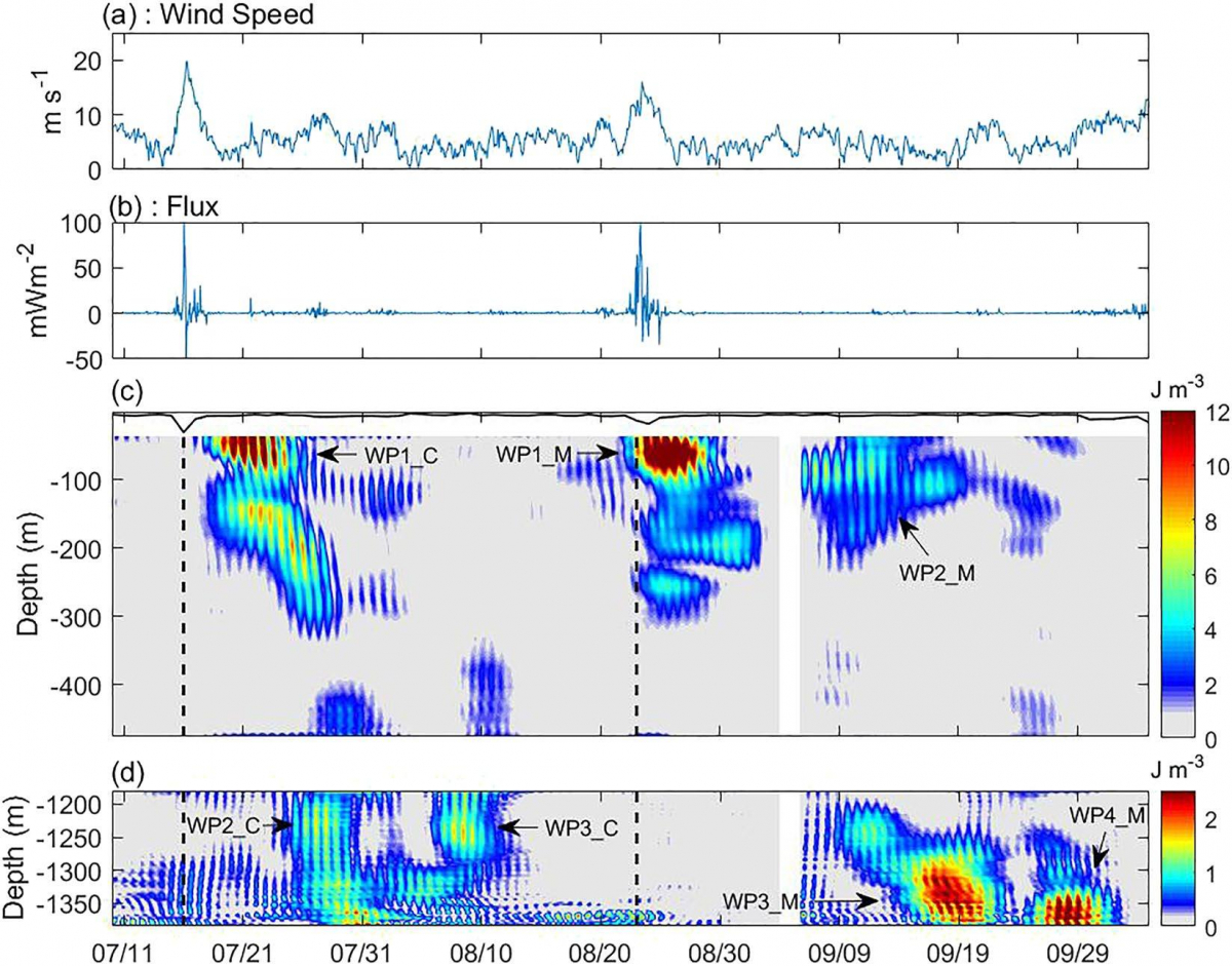 风生近惯性内波能量占海洋上层内波波谱能量的一半,是海洋中常见的一种物理过程,多见于热带气旋过境之后。风生近惯性内波由于其高的垂向速度剪切,以往大多学者认为其大部分能量将在混合层底耗散。由于其间歇性和短波包的特性,很少有观测可以捕获其完整的传播过程。风生近惯性能量能否穿透混合层下传至深海,有多少能量到达深海底边界层,这些问题尚不清楚。