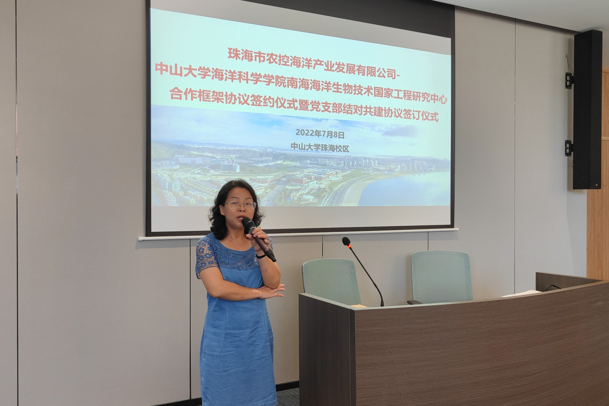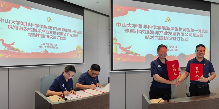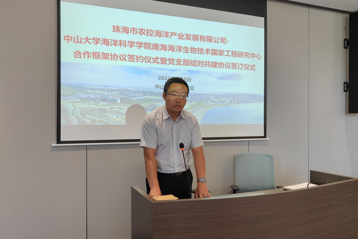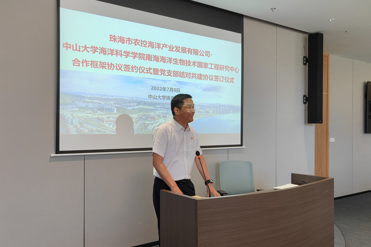 7月8日,珠海市农控海洋产业发展有限公司-中山大学南海海洋生物技术国家工程研究中心(简称“国家工程中心”)合作框架协议暨党支部结对共建协议签订仪式在珠海校区举行,金湾区农村农业和水务局总工程师廖清梅、珠海市农控海洋产业发展有限公司农控集团副总经理肖建波、海洋公司副总经理古鹏、海洋公司副总经理、党支部书记吴文中、海洋公司党务专员陈敏慧、海洋公司经营发展部经营主管陈远斌、中山大学科学研究院基地处副处长薛超、工程中心主任、海洋科学院院长王东晓教授、太阳成集团tyc9728党委书记李春荣、海洋工程与技术学院院长助理蔡华阳副教授、工程中心副主任、地球科学与工程学院黄康有副教授、工程中心副主任、太阳成集团tyc9728卢建国副教授及太阳成集团tyc9728贾坤同副教授、冯建祥副教授、林根妹副研究员等师生参加了仪式。