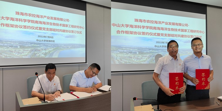 在与会人员的共同见证下,珠海市农控海洋产业发展有限公司与南海海洋生物技术国家工程研究中心签订合作框架协议,双方党支部签订结对共建协议,为下一步合作迈出关键一步。
