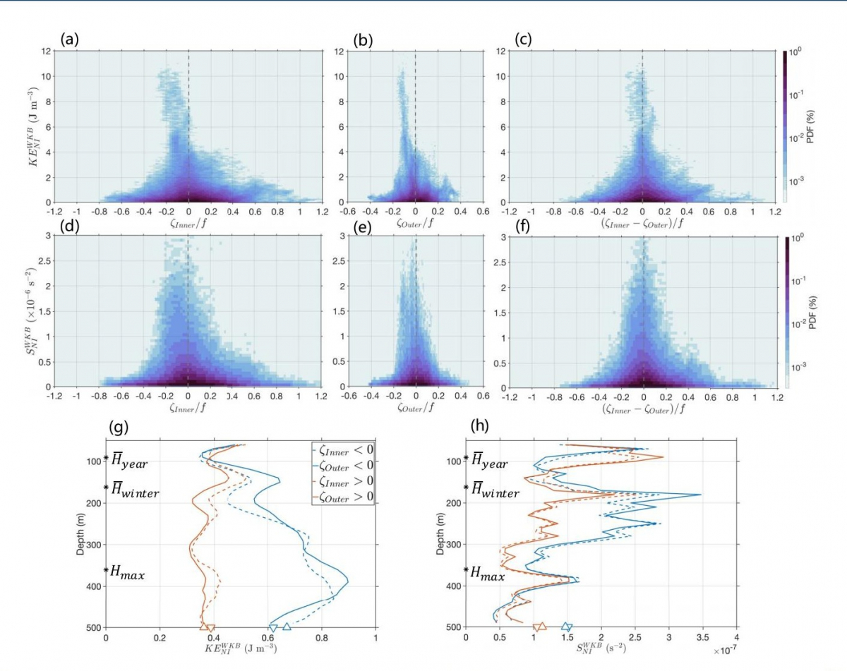 我院于小龙副教授及合作者深入分析了北大西洋中纬度海区的锚系潜标阵列数据,发现增强的近惯性能量和流速剪切主要出现在反气旋涡度区域,近惯性内波的“烟囱效应”由罗斯贝数为O(0.1)量级的中尺度涡主导(图1);与此相反,罗斯贝数为O(1)量级的亚中尺度涡对近惯性内波的“烟囱效应”影响很小,这主要是由于亚中尺度涡与中尺度涡相比,垂向、水平和时间尺度均较小。该发现揭示了促使风生近惯性内波垂向传递至深海的过程中,中尺度反气旋涡发挥着非常重要的作用,有助于深海产生强湍流混合区域近惯性内波的精准探测。